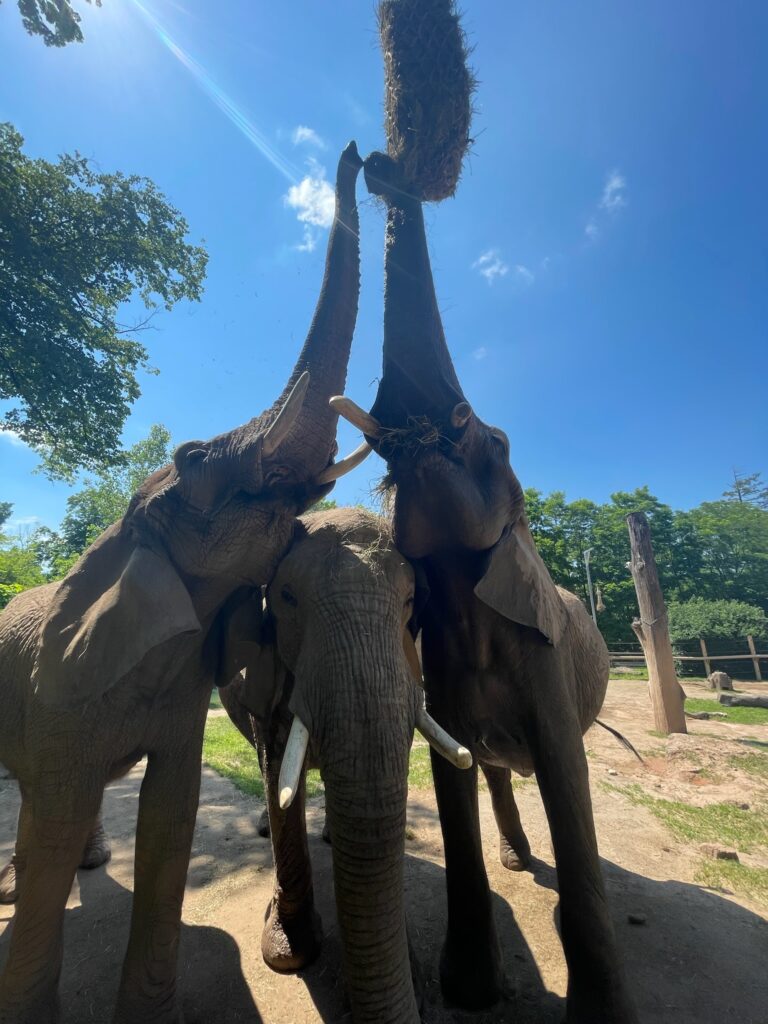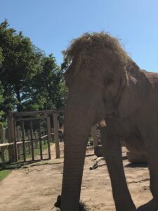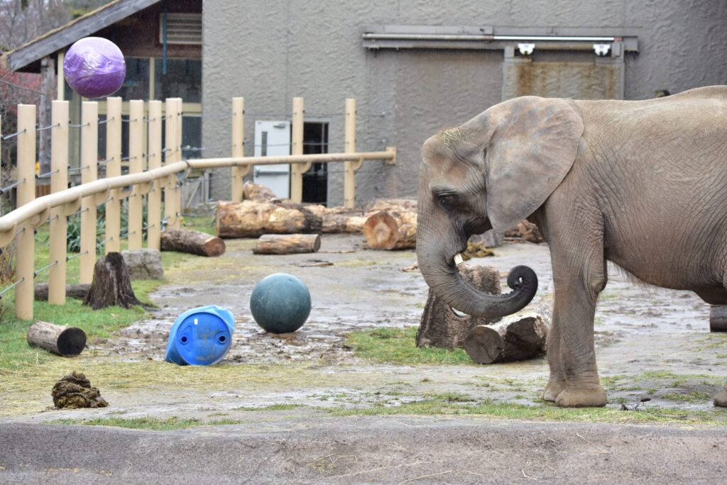 You may be surprised to learn that Genny C is also a very talented kickball player. During your zoo visit, you might be lucky enough to catch Genny C in action. We have a special ball that we can toss for the elephants, and Genny C can “kick” it with her trunk. Sometimes she can really get it to catch some air! Elephant kickball is a unique, mentally stimulating form of enrichment for our elephants.